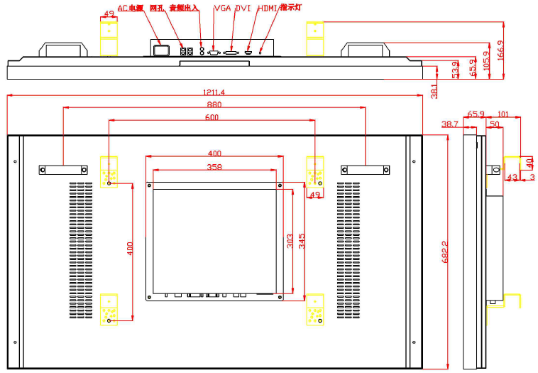 HDMI/DVI/VGA/AV/USB/RS232/ 电源接口 |